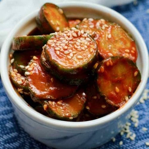 Concombres assaisonnés d’une vinaigrette pimentée à base de sauce soja, miel, vinaigre de riz et piment coréen, le tout parsemé de sésame
