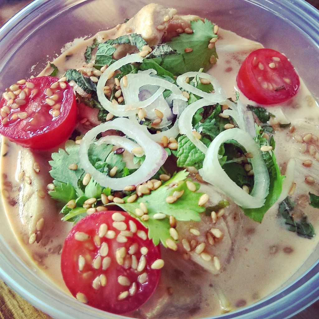 Poulet, curry rouge, lait de coco, citronnelle, nouilles de riz, basilic thaï.