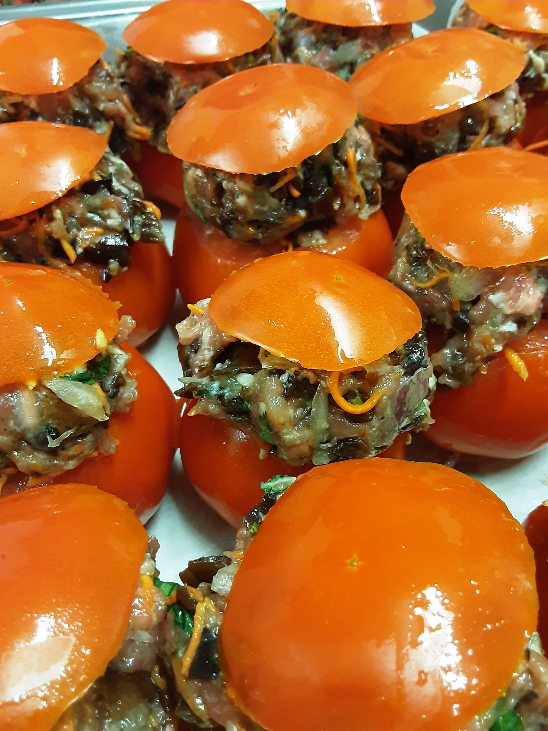 Tomates farcies d’une farce de porc, carottes, echalottes, champignons noirs et sauce soja.