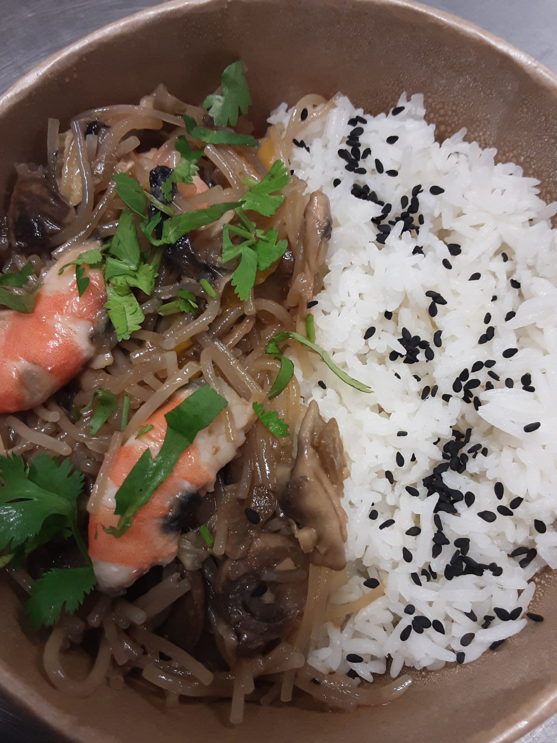 Vermicelles de soja sautés avec des légumes et des crevettes. Plat servi avec du riz.